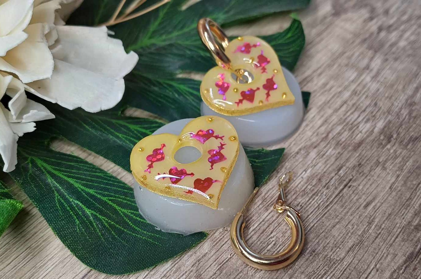 Ces pampilles sont en résine avec pour inclusion de jolies petites billes dorée et des coeurs holographiques, il est donc conseillé de ne pas les mouiller et de les ôter pour la douche et les baignades.
