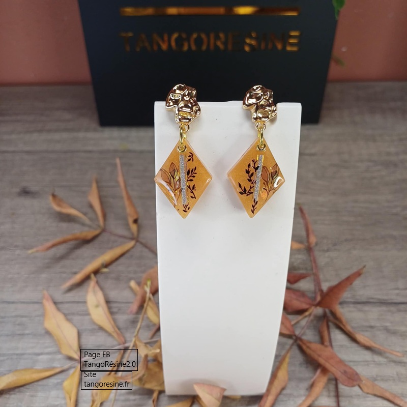 Couleur ambre doré, petites feuilles figées dans la résine… tout me rappelle les balades en forêt, les trésors ramassés au sol, les lumières douces de fin de journée.