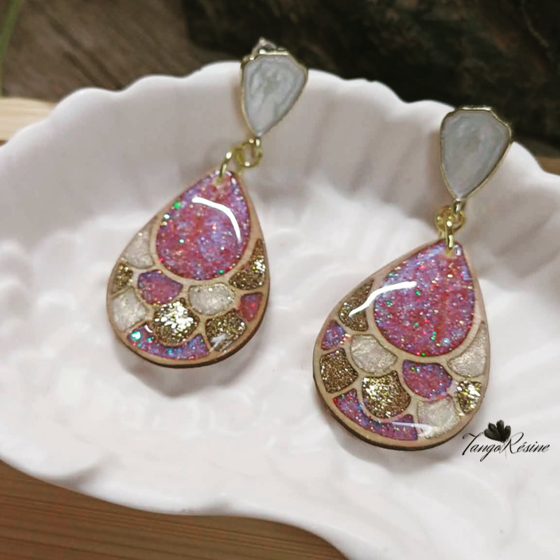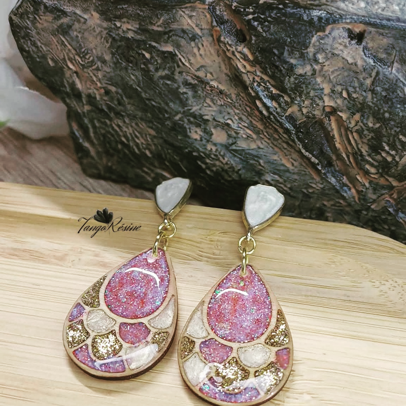 Je vous présente une nouvelle paire de BO de ma collection Bohème. Réalisées en bois et résine, aux nuances roses scintillantes, relevées de touches dorées et blanc nacré. Leur forme en goutte leur donne un style doux et élégant, je les trouve parfaites pour accompagner vos tenues du quotidien ou une occasion spéciale.