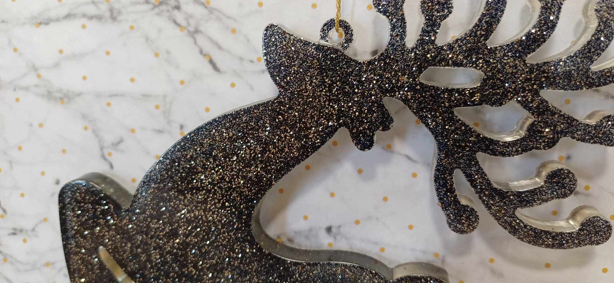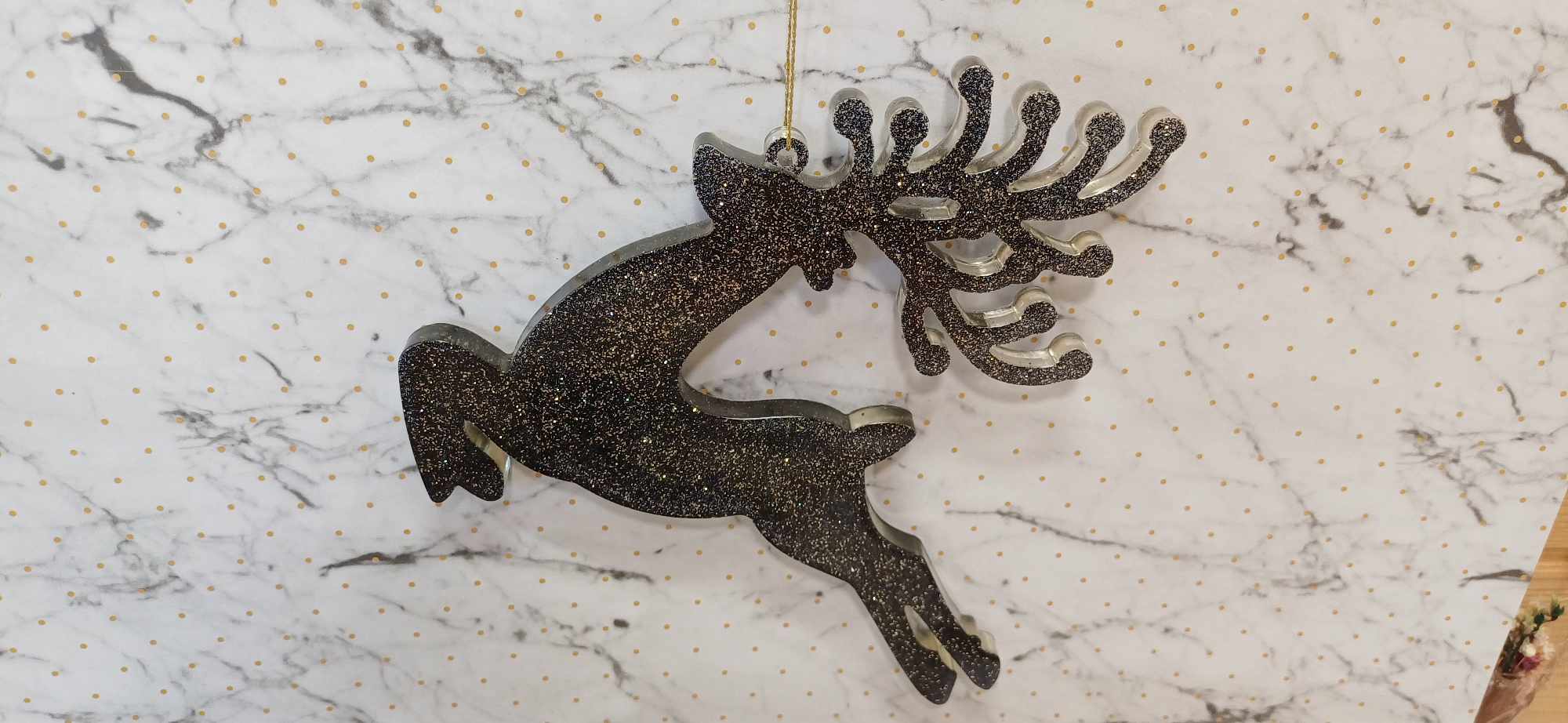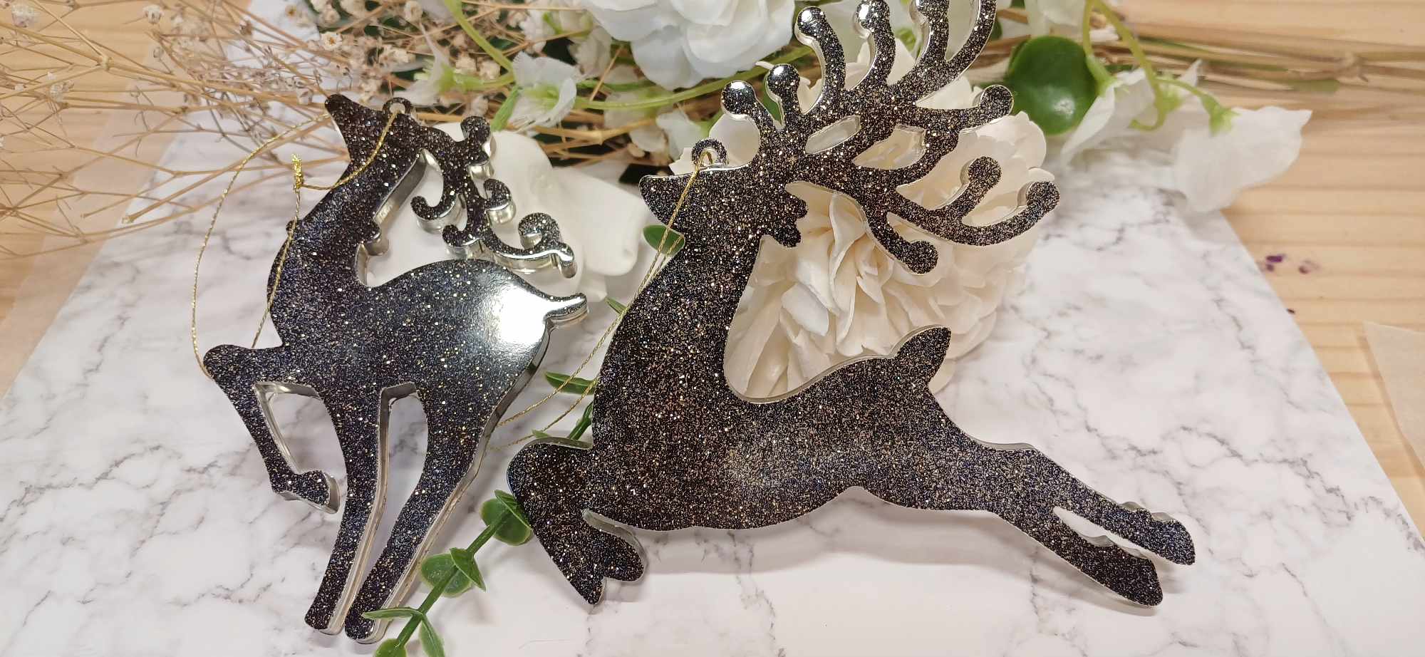 Lot de 2 cerfs de Noël Tornade noir ornés de paillettes argent pour suspension.