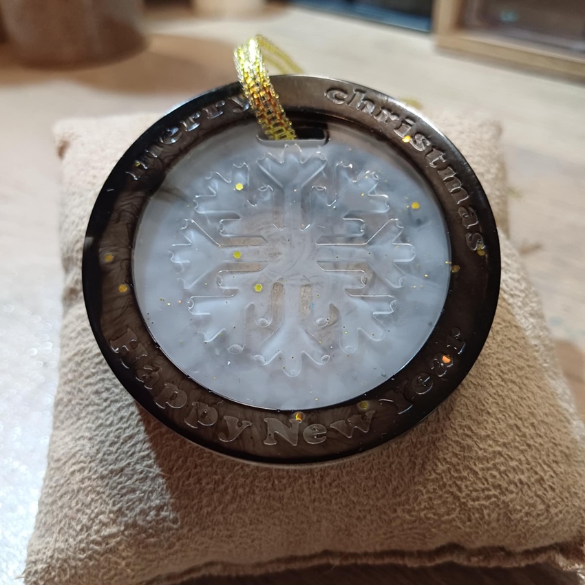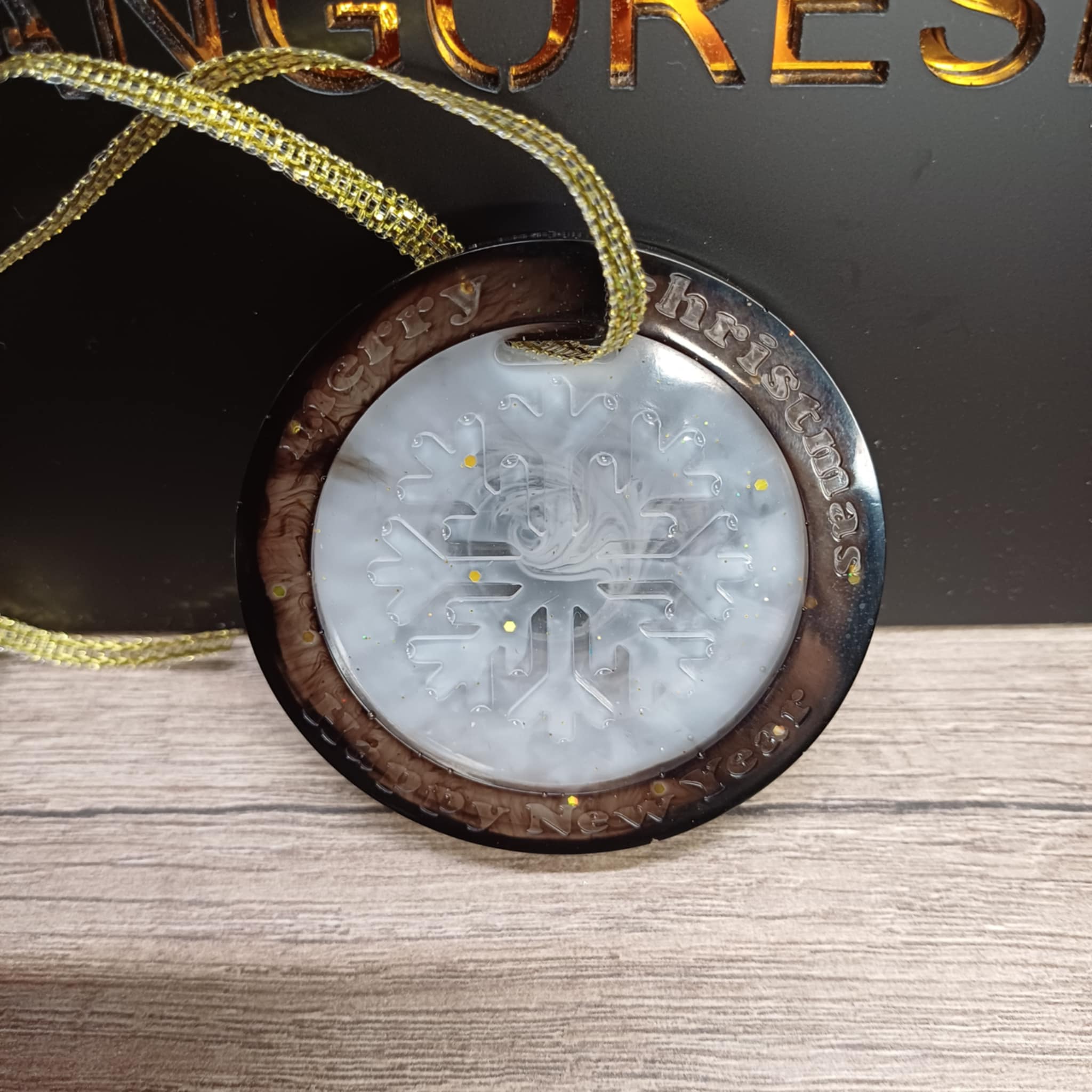 « Flocon Obéron » est d’un magnifique dégradé de marron avec quelques reflets discrets d’or. Son cœur est blanc fumé. Inscription sur le contour » Merry Christmas & Happy New year ».