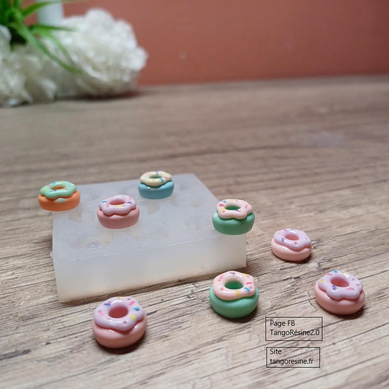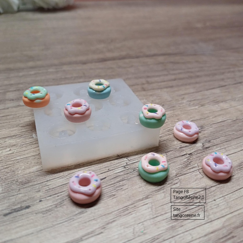 Moule en silicone contenant 9 petits Donuts pour des boucles d’oreille, des colliers ou bracelets petites filles ou à poser en décor de table. Donuts à dos plat…